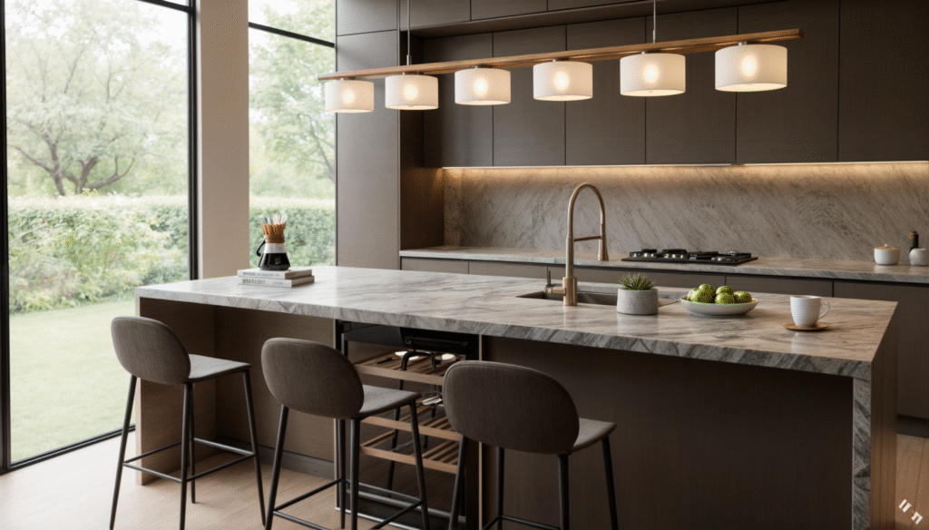 Bu salonda, malzemeler arasındaki dengeyi ön plana koymayı hedefledik. Doğal taşın güçlü etkisini, ahşabın sıcaklığıyla bir araya getirerek mekâna hem sofistike hem de yaşanabilir bir atmosfer kazandırmayı amaçladık. Açık plan kurgusu sayesinde alanlar arasında akışkan bir ilişki kurarken, geniş açıklıklarla gün ışığını iç mekânın en önemli unsurlarından biri haline getirdik.